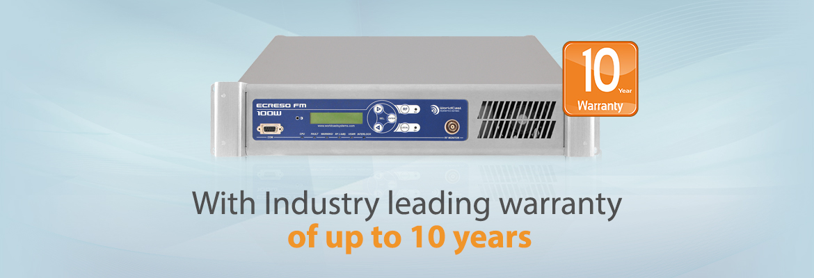 WorldCast Systems offers a standard warranty of 3 years on all our FM transmitters and up to TEN YEARS' Warranty on our range of compact FM transmitters and new ECRESO FM 5kW/10kW for a small additional charge.