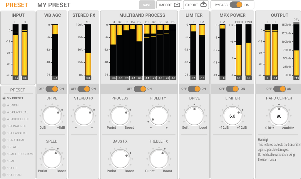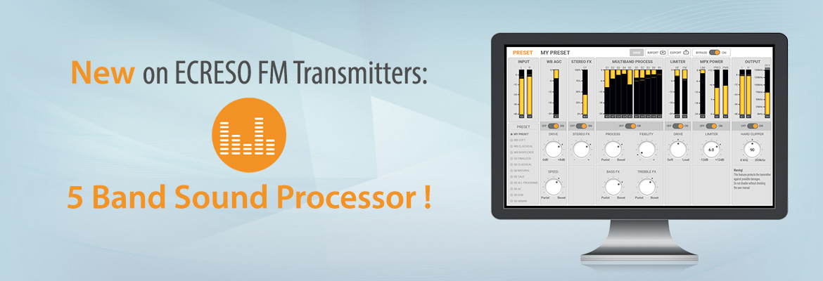 Based on a 6th Generation MOSFET, the Ecreso FM 750W is highly robust and delivers efficiency of up to 70%. Top signal quality and performance are achieved thanks to the “FM Band Direct to Frequency” Digital Modulator. It also offers several innovative features such as dynamicRDS encoding and 5 band sound processing.