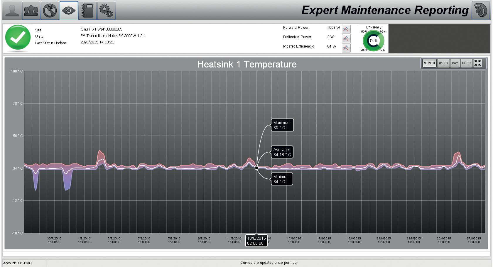 EMR is a proactive service available on ECRESO FM Transmitters. It sends the user regular reports on the status of key parameters such as temperatures, currents and voltages, plus information on the performance and lifespan of components such as the fan and power supply of the transmitter.