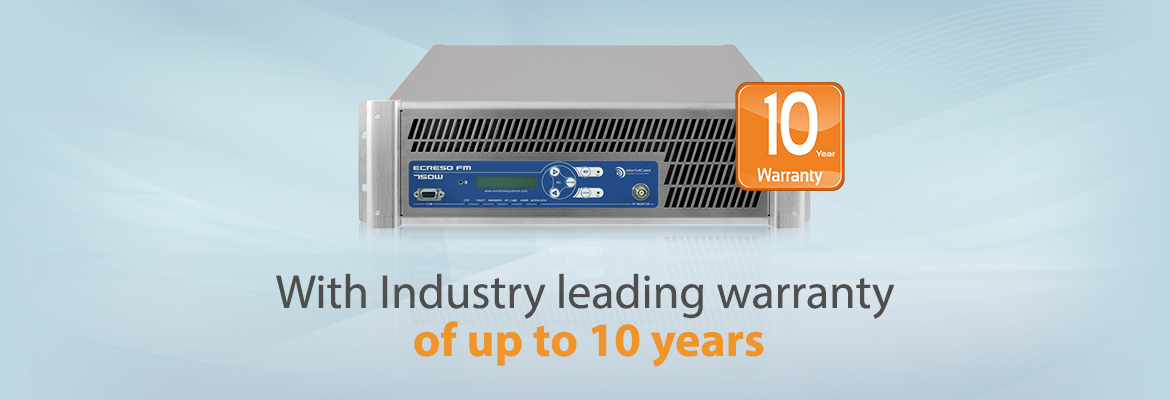 WorldCast Systems offers a standard warranty of 3 years on all our FM transmitters and up to TEN YEARS' Warranty on our range of compact FM transmitters and new ECRESO FM 5kW/10kW for a small additional charge.