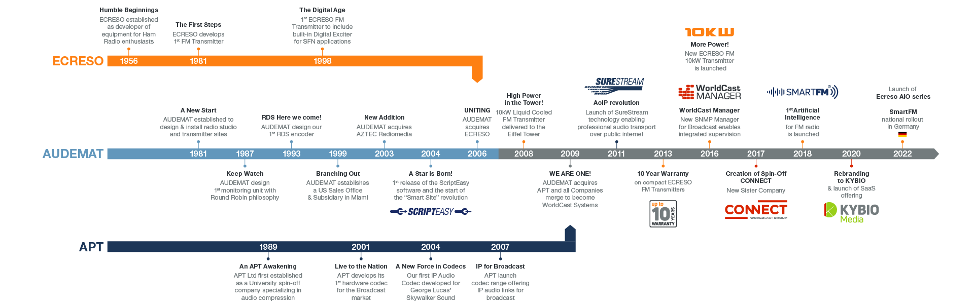 Its industry leading brands are APT, Ecreso, Audemat, and Kybio address the needs of audio / video transport, radio broadcast, and media supervision. This covers audio/MPX codecs, virtualized solutions, FM transmitters, DAB/FM test and measurement, as well as monitoring and control. From products to turnkey solutions, WorldCast Group accompanies its customers throughout all phases of their project.