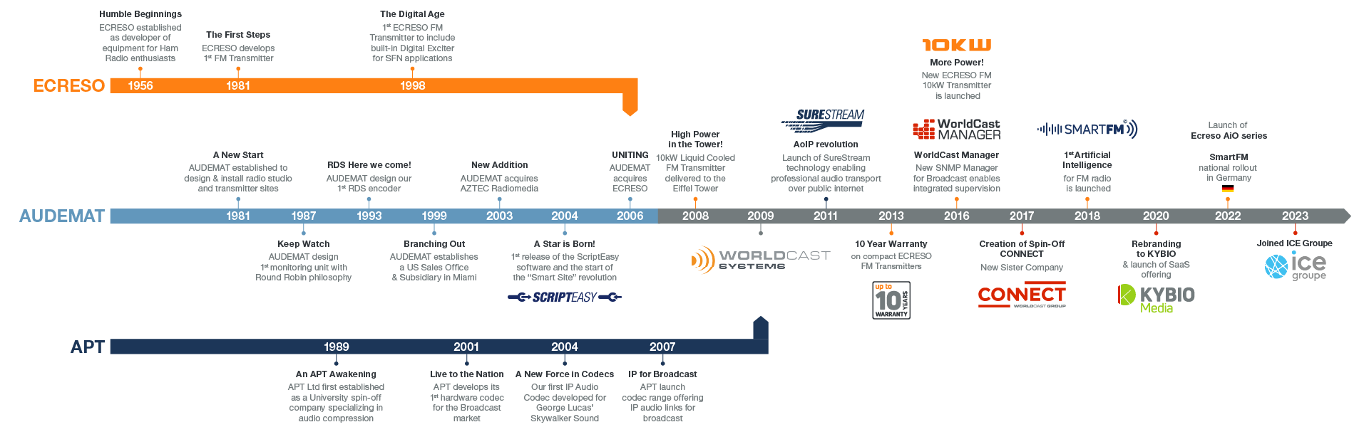We are an alliance of 3 broadcast companies brought together with WorldCast Systems. Our history goes back to 1956 and we are today recognized as a leading worldwide supplier of broadcast hardware and software, trusted by major public and private network operators, governments, and radio / TV content providers.