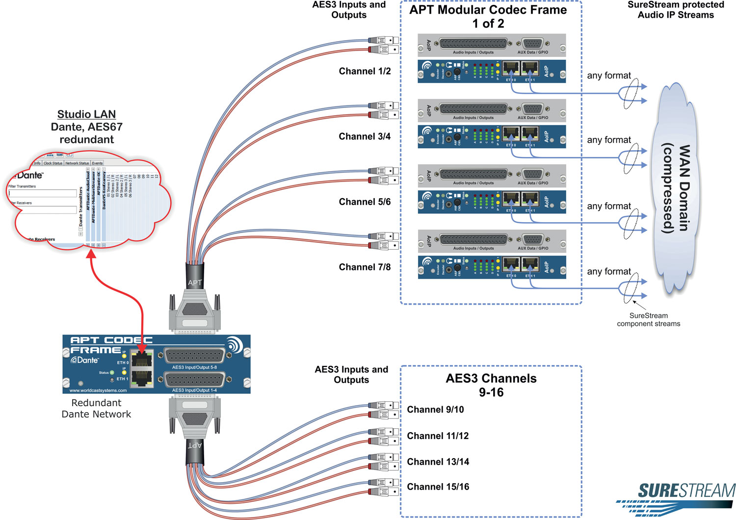 With the Dante interface fitted, your AoIP multichannel codec becomes the gateway from your local Dante domain to any network destination over external networks.