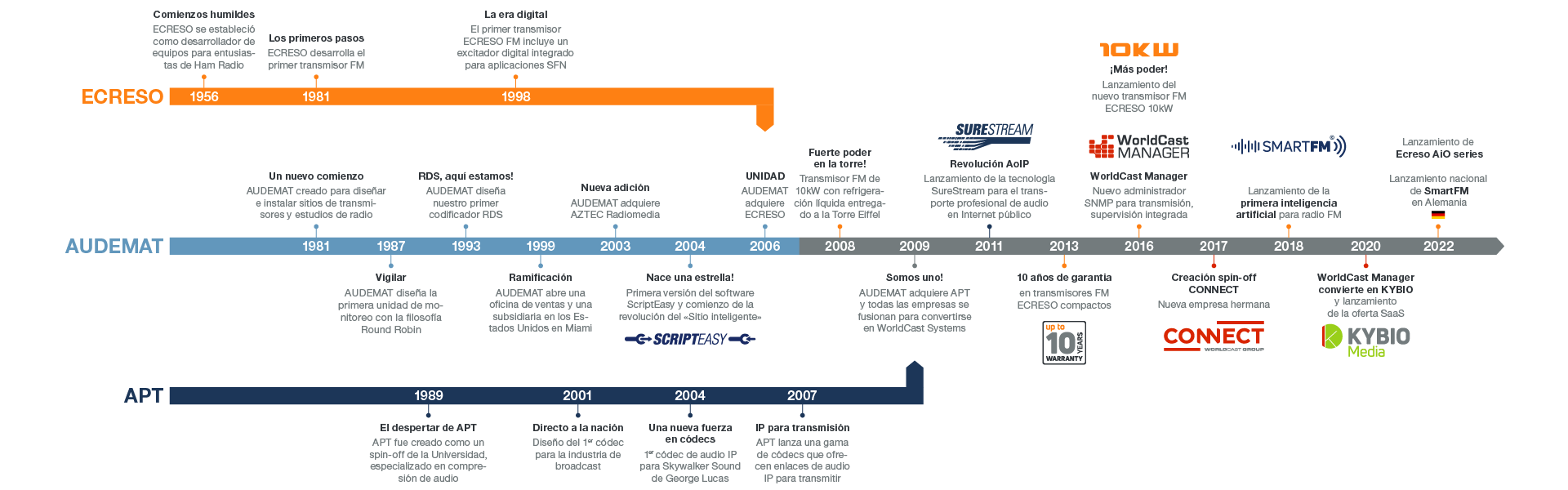 Somos una alianza de 3 compañías de transmisión reunidas con WorldCast Systems. Nuestra historia se remonta a 1956 y hoy somos reconocidos como un proveedor mundial líder de hardware y software de transmisión, confiables por los principales operadores de redes públicas y privadas, gobiernos y proveedores de contenido de radio / TV.