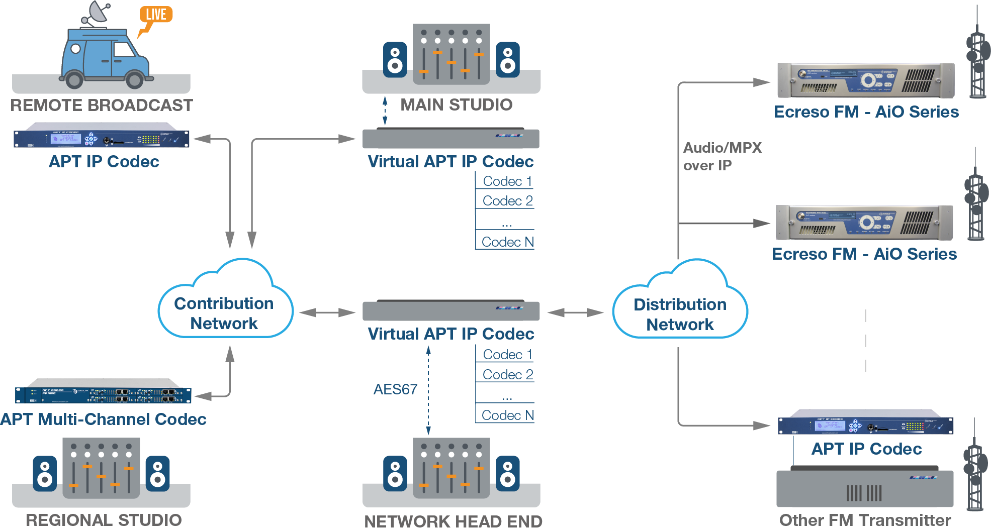 Como solución basada en servidor, el Virtual APT IP Codec permite una codificación/decodificación de alta densidad desde un único servidor, sin comprometer los estándares de calidad APT. Las emisoras se benefician de una solución muy flexible y escalable y pueden reajustar el tamaño de su red según sea necesario. SureStream, aptX mejorado y APTmpX para transmisiones compuestas/MPX de baja velocidad de bits también constituyen un ecosistema que proporciona una distribución de audio/mpx de alta calidad y gran disponibilidad fuera de las costosas vías de transmisión.