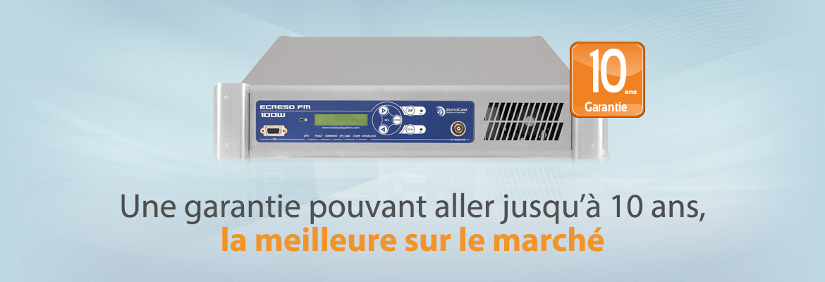 Nous offrons une garantie standard de 3 ans sur tous nos émetteurs FM et jusqu’à 10 ans, oui, DIX ANS, sur notre gamme d’émetteurs FM compacts et notre nouvel ECRESO FM 5 kW/10 kW pour une somme modique supplémentaire. Aucun autre fabricant d’émetteurs