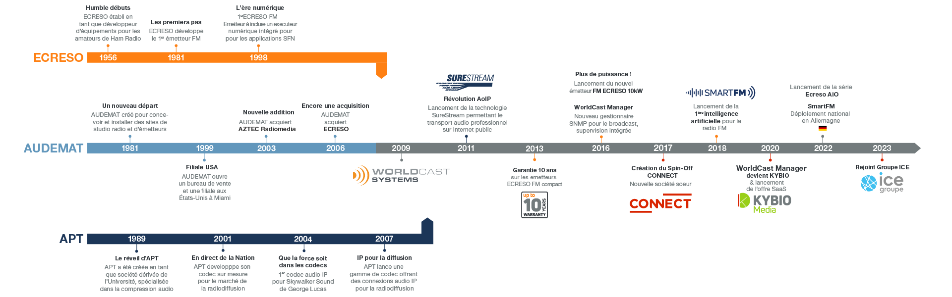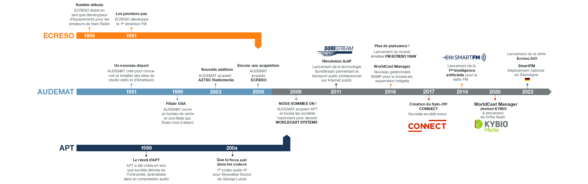 Ses marques APT, Ecreso, Audemat et Kybio adressent les besoins en transmission de flux audio et vidéo, diffusion radio et supervision des infrastructures media. Du produit aux solutions clés en main, le groupe WorldCast accompagne ses clients tout au long de leurs projets.