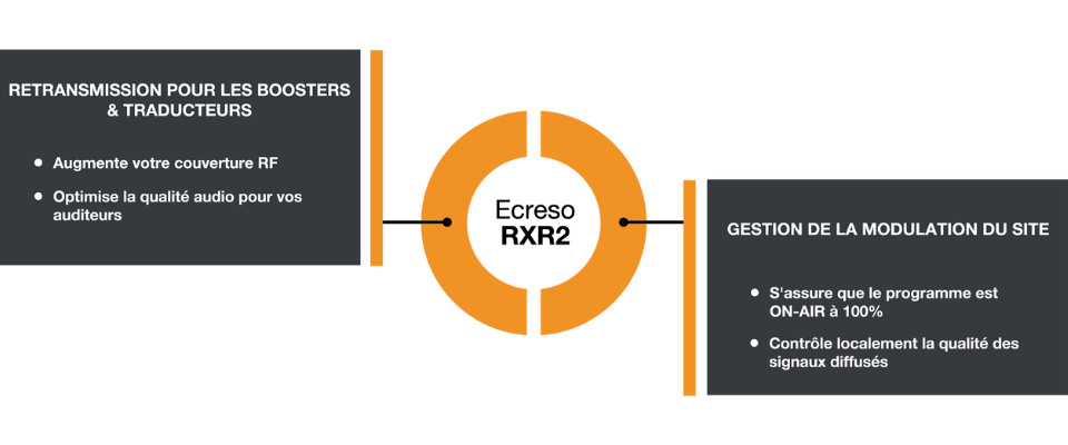L'Ecreso RXR2 est équipé de deux tuners FM indépendants, permettant le décodage simultané de deux programmes FM. Grâce à la surveillance intégrée, l'appareil bascule automatiquement sur la deuxième fréquence de secours en cas de perte audio. En cas de défaillance sur la fréquence de secours, la fonction de coupure automatique désactive automatiquement toutes les sorties.
