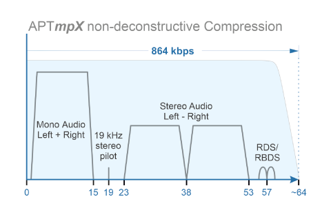 Generating the final processed signal at the transmitter sites requires radio stations to maintain duplicate (and expensive) equipment at each site. By compressing the signal from 2.1MBits to 860kBits WorldCast explains that the APTmpX allows the MPX/composite signal to be assembled at a central point of processing. It’s then transported to the transmitter site for broadcast, eliminating the need for the maintenance of any MPX/composite processing equipment at each transmission station, with the exception possibly of a final limiter or clipper.