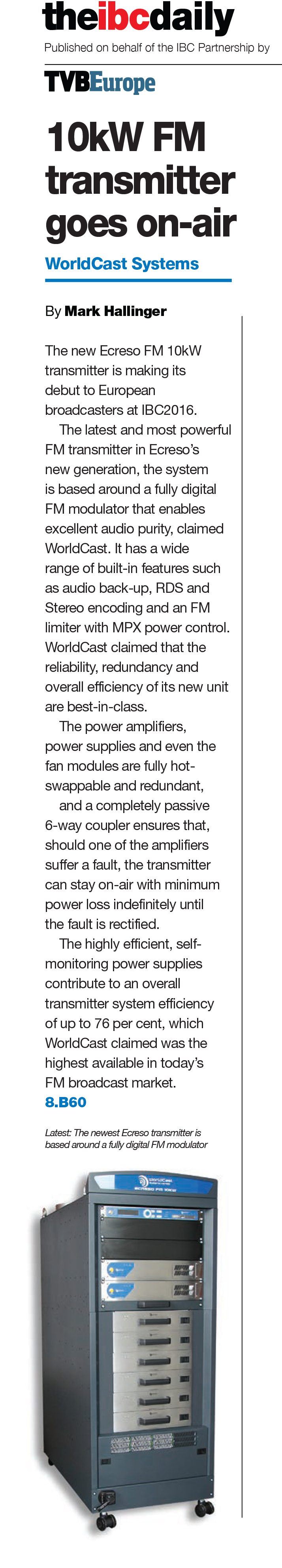 10kW FM transmitter goes on-air WorldCast Systems - IBC Daily news 11 09 2016